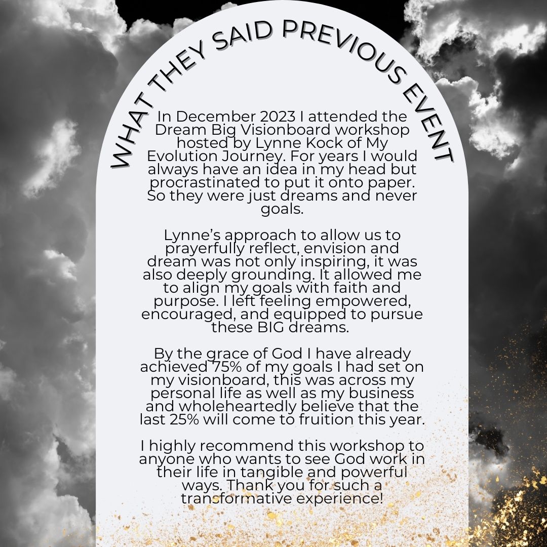 You won't just attend a workshop; you'll embark on a journey that will leave you hungry for the realization of your deepest desires based on the stirrings that God has placed inside you. Our aim is to ignite your faith, to set your soul on fire, and to empower you to dream bigger than ever before.